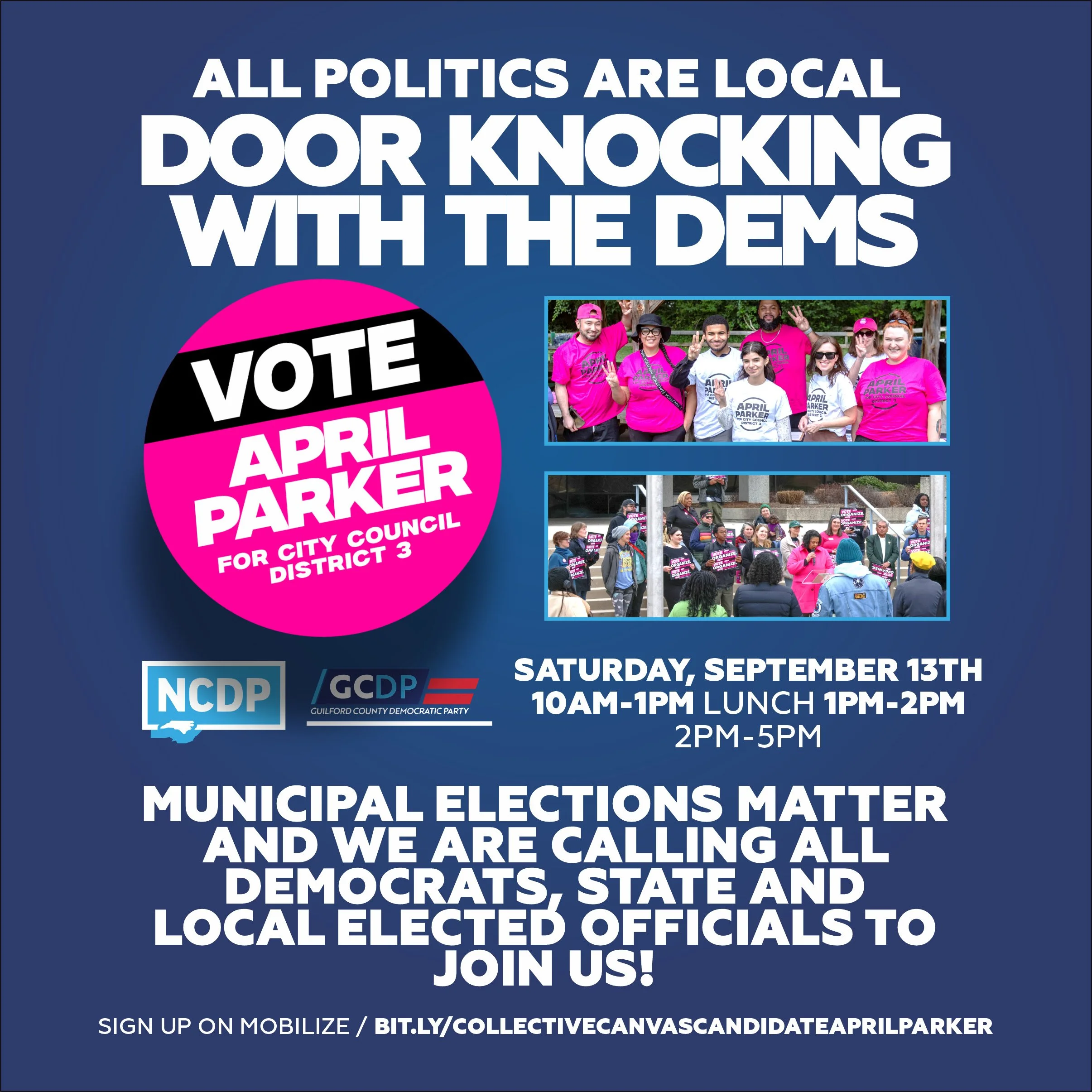 Canvass for April Parker who is running for Greensboro City Council D3. Sunday mornings will be lit drops. Wednesdays, Saturdays and Sunday afternoons will be canvassing.